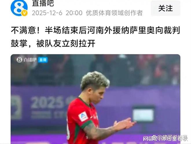 在足協(xié)杯決賽中,志在奪冠的河南隊0-3完敗于北京國安,再次與冠軍獎杯失之交臂。丟冠已經(jīng)夠鬧心了,今天河南隊又被推上了風(fēng)口浪尖。轉(zhuǎn)播鏡頭中一個細節(jié)突然在社交平臺上傳播開來,河南隊的外援納薩里奧在比賽終場時朝韓國主裁判高亨進鼓掌。